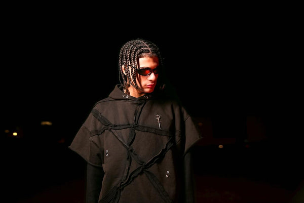 A layered black tee constructed with raw diagonal seams crossing the body. The surface is accented with embedded metal details integrated into the fabric. The piece is paired with an undershirt, attached to form a set, designed with extended and split-cut sleeves that alter the silhouette and movement of the garment. Produced in a run of ten.